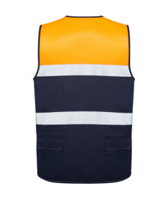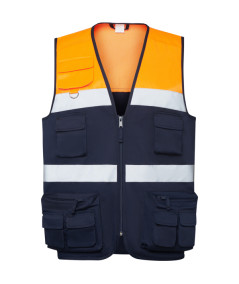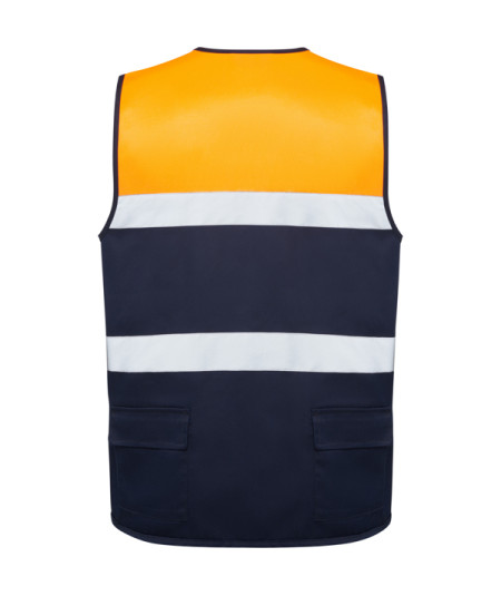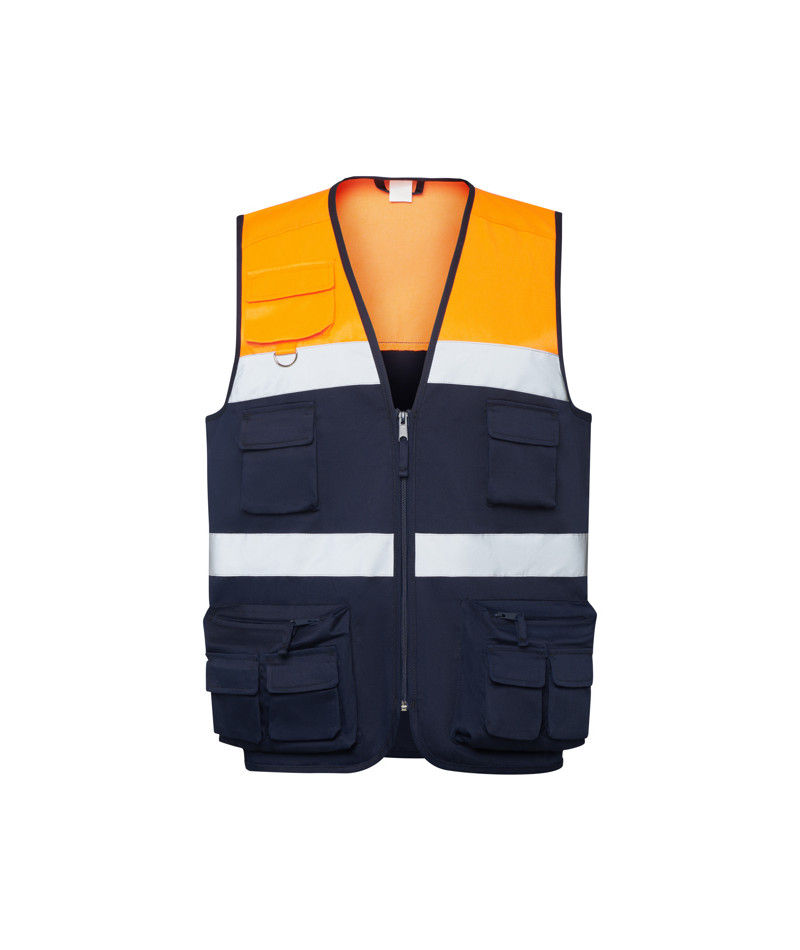 Chaleco multibolsillos bicolor de alta visibilidad. ·Dos bandas reflectantes en horizontal. ·Cuello en pico. ·Cremallera frontal con tirador. ·Bolsillo superior derecho con argolla metálica. ·Dos bolsillos entre bandas con tapeta y cierre de velcro. ·Dos bolsillos laterales con cremallera y superpuestos dos bolsillos con tapeta y cierre de velcro. ·Dos bolsillos traseros con tapeta y cierre de velcro. ·Bordes ribeteados con un vivo del mismo tejido.